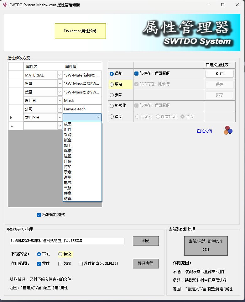 1,属性管理器支持装配多选批处理,支持多级路径批处理,支持零件、装配、焊件轮廓批处理,具备增删改三张自定义表单的存储功能